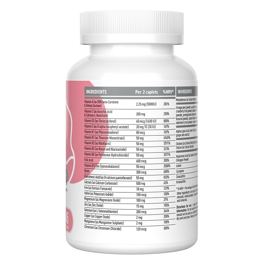- Витамины A, C, D3, E, K1, B1, B2, B3 (ниацин), B5, B6, B7 (биотин), B9 (фолиевая кислота), B12 способствуют общему укреплению организма женщины и предотвращает дефицит витаминов.
